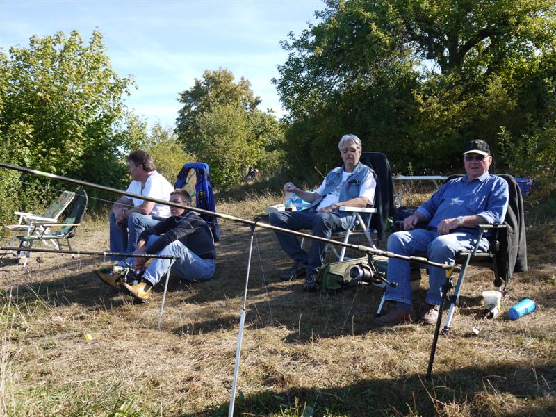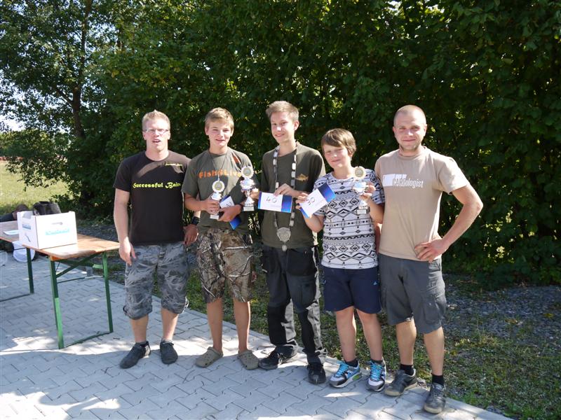 Am 09.09.2012 fand das Königsfischen an der Ehmetsklinge in Zaberfeld statt. Wegen kleinen Abstimmungsproblemen konnten wir leider erst gegen 8 Uhr beginnen. Gefischt wurde im Bereich des Vereins Zaberfeld und am Damm Richtung Badestrand (zwecks Platzmangel). Petrus meinte es an diesem Tag zu gut mit uns. Es war viel zu heiß. Gefangen wurden überwiegend Rotaugen. Als gegen 11 Uhr die ersten Badegäste mit Tretbooten und Luftmatratzen überall auf dem See unterwegs waren gab es keine Bisse mehr. Die Jugend vom Zaberfelder Verein versorgte uns direkt am Wasser mit Roten Würsten und Getränken und baute für uns auch Biertischgarnituren auf. Der Hitze wegen zogen einige von uns gegen später einen Schattenplatz vor und gaben das Angeln auf. Offizielles Ende war um 14Uhr Anschließend trafen wir uns in dem Zaberfelder Vereinsheim am Muttersbach. Dort gab es zum Abschluss gegrillte Steaks. Es waren 25 Teilnehmer am Start, davon 3 Jugendliche. Das Gesamtgewicht der gewerteten Fänge betrug 4540gr. Platzierungen: 1. Schmidt Helmut mit einem Zander von 2.080gr. 2. Littwin, Johann mit einem kleinen Hecht von 820gr. 3. Hartmann, Johann mit einem Rotauge von 280gr. 4. Dumler, Alex Rotauge 200gr. 5. Steinberg, Norman Rotauge 180gr. (Durch Los) 6. Meyle, Günter Rotauge 180gr. (durch Los) Jugend: 1. Hirschle, Alex Rotauge 320gr. 2. Kahle, Philipp Rotauge 280gr. 3. Lober, Simon Rotauge 200gr. Die Siegerehrung der Erwachsenen wurde von unserem Hauptgewässerwart Hans-Peter H. durchgeführt. Die Siegerehrung der Jugend übernahm unser Jugendleiter Timo V.. Abschließend ein herzliches Dankeschön an alle die zum erfolgreichen Gelingen des diesjährigen Königsfischen beigetragen haben.