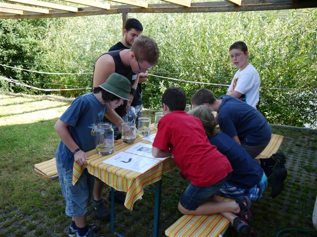 1. Gerätekunde Hier erklärten die beiden Nachwuchsangler Alex Hirschle und Marcel Haab, welche Ausrüstung zum Angeln benötigt wird und wie sie funktioniert. Auch über die Fischerprüfung, an der man frühestens mit 10 Jahren teilnehmen darf, wurde heiß diskutiert und viele Fragen gestellt und beantwortet. Zudem wurde über Schwimmer, Wobbler, Blinker, Twister und so weiter geredet. Manche Gruppen hatten am Ende doch ihre Probleme mit den vielen Fachbegriffen: Die Hakenlöser-Zange war plötzlich ein „Zangenlöser“ und der „Stahl-Haken-Fang“ war eigentlich ein Stahlvorfach. |  | 2. Kleintiere im Wasser Axel Palesch und Jugendwart Timo Veser haben schon im Voraus Kleinstlebewesen aus der Enz und dem Neckartalsee gefangen und präsentierten diese nun in Wassergläsern den interessierten Teilnehmern. Eigenständig wurden Steckbriefe und Namen zugeordnet. Danach erläuterte der Jugendwart die Besonderheiten jedes Lebewesens. Staunen verbreitete sich bei den Kindern: Was? Die Kamberkrebse atmen mit den Beinen? Jein – Fast richtig: Ihre Kiemen befinden sich an ihren Beinen. |  | 3. Fischkunde Der Vorstand des Angelsportverein Markus Haab und der Nachwuchsangler Simon Lober brachten den Kindern die Artenvielfalt der Fischwelt näher. Zudem wurden Nahrung, Verhalten, Körperbau und Lebensraum verschiedener Fische aus der Enz und dem Neckartalsee besprochen. |  | 4. „Casting“-Werfen Beim sogenannten Casting wird mit der Angel auf eine Zielscheibe geworfen. Dabei erläuterten Roland Steur und Hauptgewässerwart Hans-Peter Hirschle, welche Wurftechniken es gibt und was dabei zu beachten ist. Jedes Kind durfte mehrere Male mit der Angel zur Probe werfen. Anschließend wurden die Würfe gewertet. |