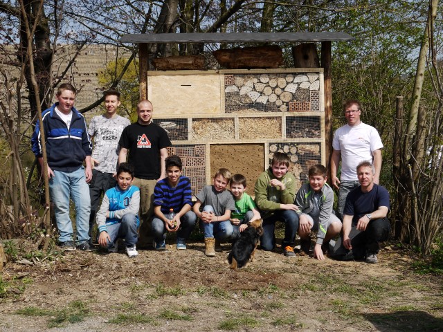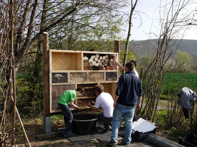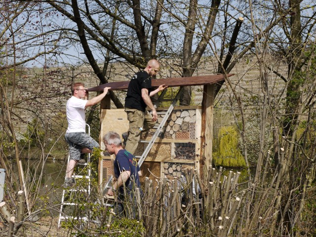 Ein Insektenhotel ziert ab sofort den Neckartalsee in Besigheim. Die Jugendgruppe des Angelsportverein Besigheim plante seit Anfang 2014 das Projekt Insektenhotel. „Wir kümmern uns nicht nur um die Fische, sondern schützen auch die Natur rund ums Wasser.“, so der Jugendwart Timo Veser. Ein Insektenhotel kann verschiedenen Insekten Unterschlupf, Überwinterungsmöglichkeit oder Nisthilfe bieten. Welche Insektenarten sich ansiedeln, hängt von den verschiedenen „Zimmern“ ab. Jedes Material lockt eine andere Insektenarten an. Der Angelsportverein legt seinen Schwerpunkt auf Hummeln und diverse Bienen. „Wenn wir Glück haben, kommen auch Marienkäfer und Schmetterlinge“, so der zweite Vorsitzende des Angelsportvereins Raphael Kaiser.