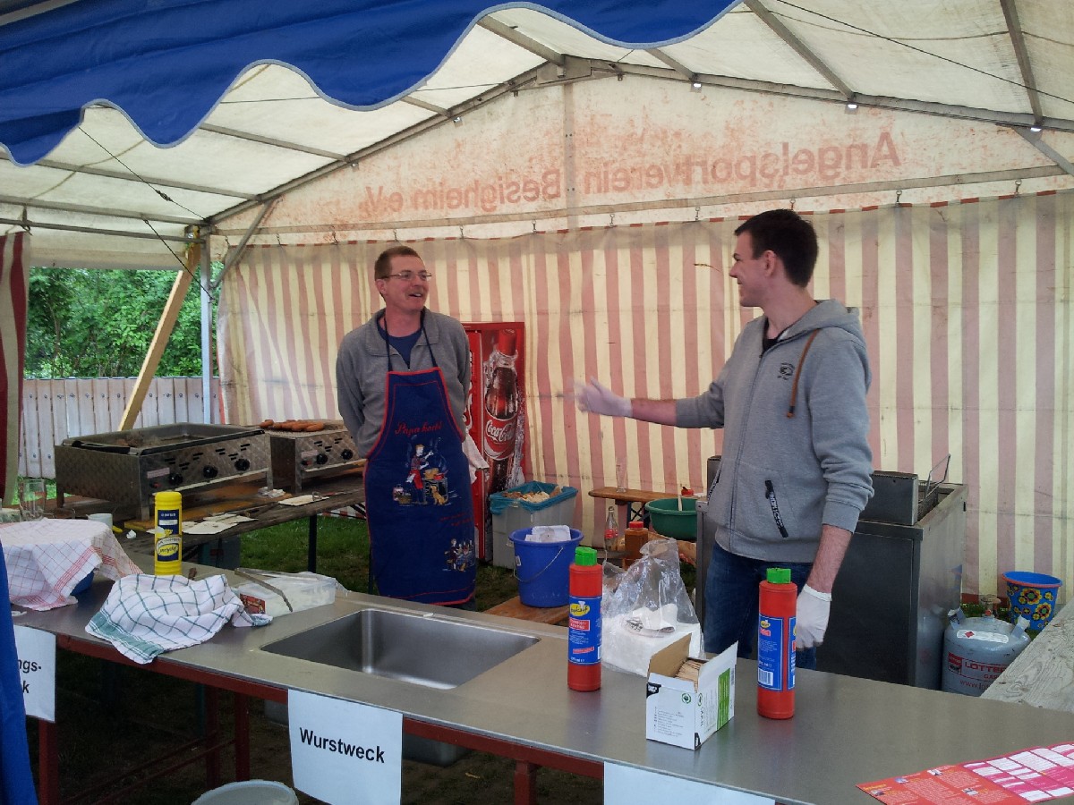 Der 1. Mai war leider etwas verregnet. Der ganz große Andrang, wie man es von schönem Wetter gewohnt ist, blieb leider aus. Dennoch war das Zelt beim ASV immer gut besucht. Die Wanderer waren froh hier eine Rast einlegen zu können um kurzzeitig um Trockenen zu sitzen. Das Schankteam um Thomas Reichert und Joe Littwin hatte alles voll im Griff. Sei es am Grill bei Fleisch und Rote Wurst, an der Friteuse bei den Pommes, bei Kaffee und Kuchen, in der Küche beim zubereiten der Heringsbrötchen oder am Zapfhahn. Alles lief reibungslos und die Kundschaft war zufrieden. Als es am Abend dann etwas ruhiger wurde haben auch alle ASV-ler fleißig zusammengeholfen und den ersten Teils der Aufräumarbeiten bereits erledigt. Bei Einbruch der Dunkelheit saß man noch kurz in gemütlicher Runde zusammen und ließ den Tag Revue passieren.